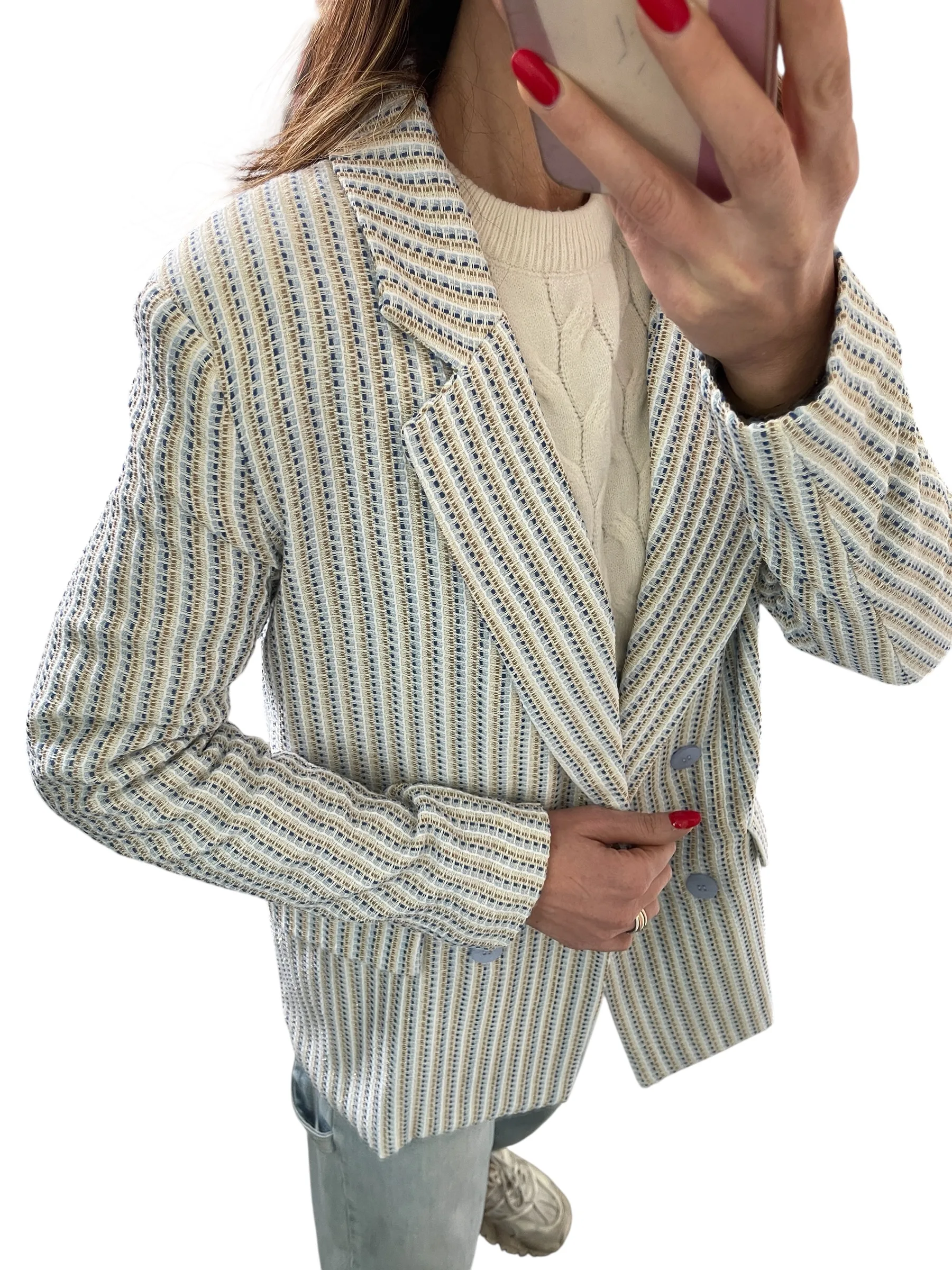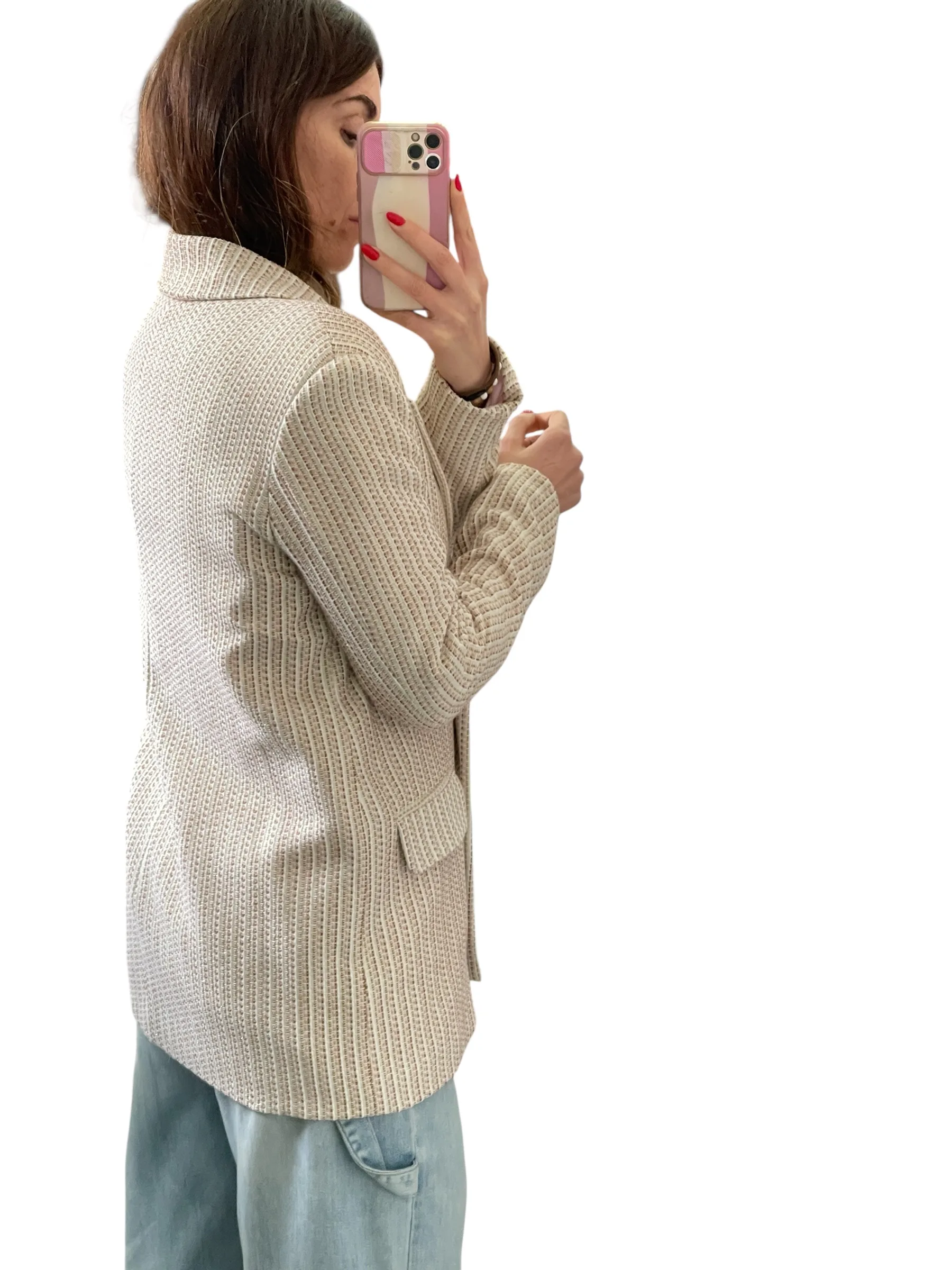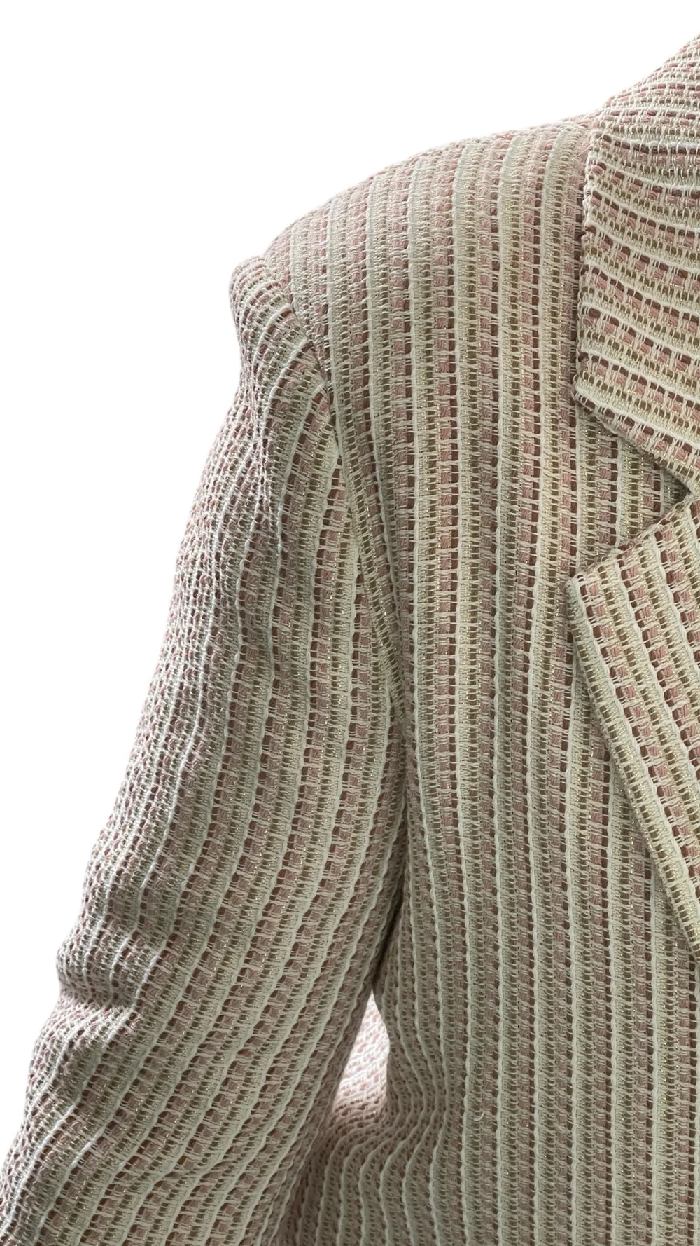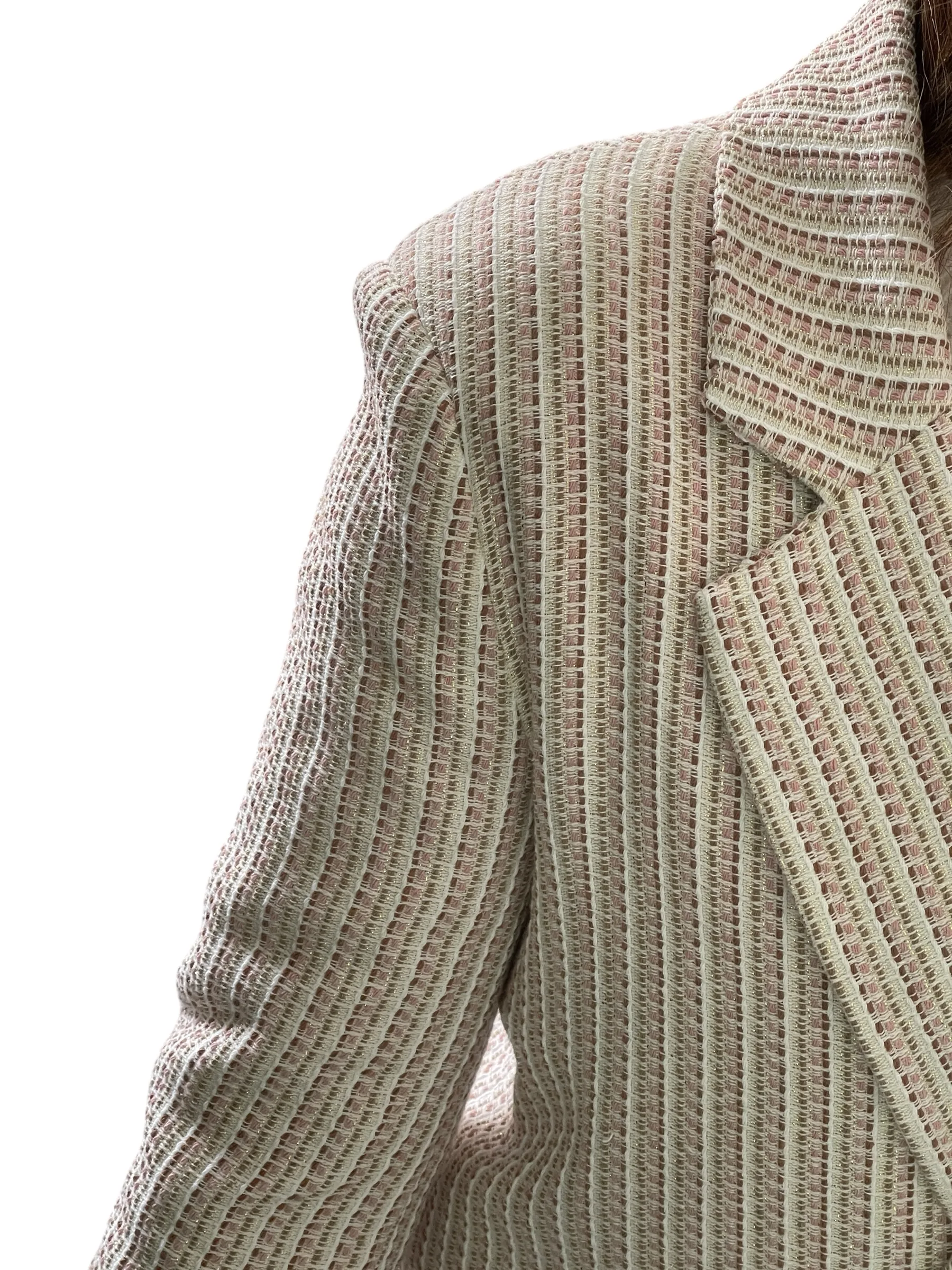 Giacca strutturata con spalline, doppio petto foderata, tessuto chanel con filamenti in lurex.
