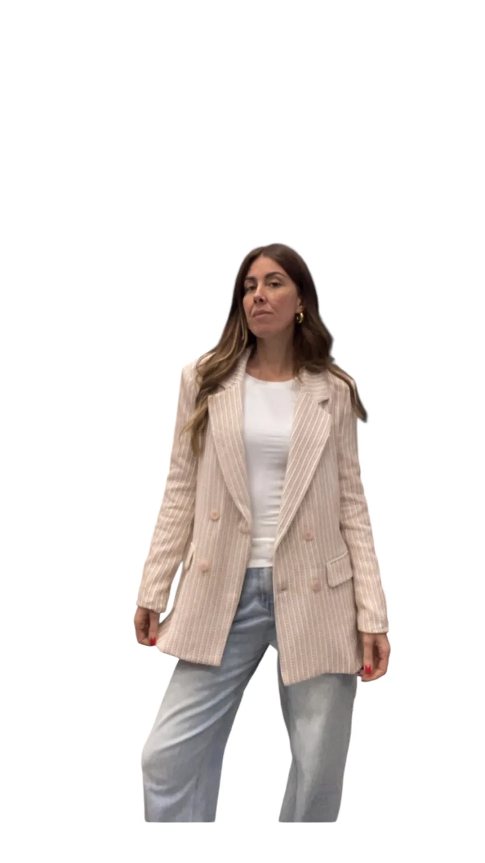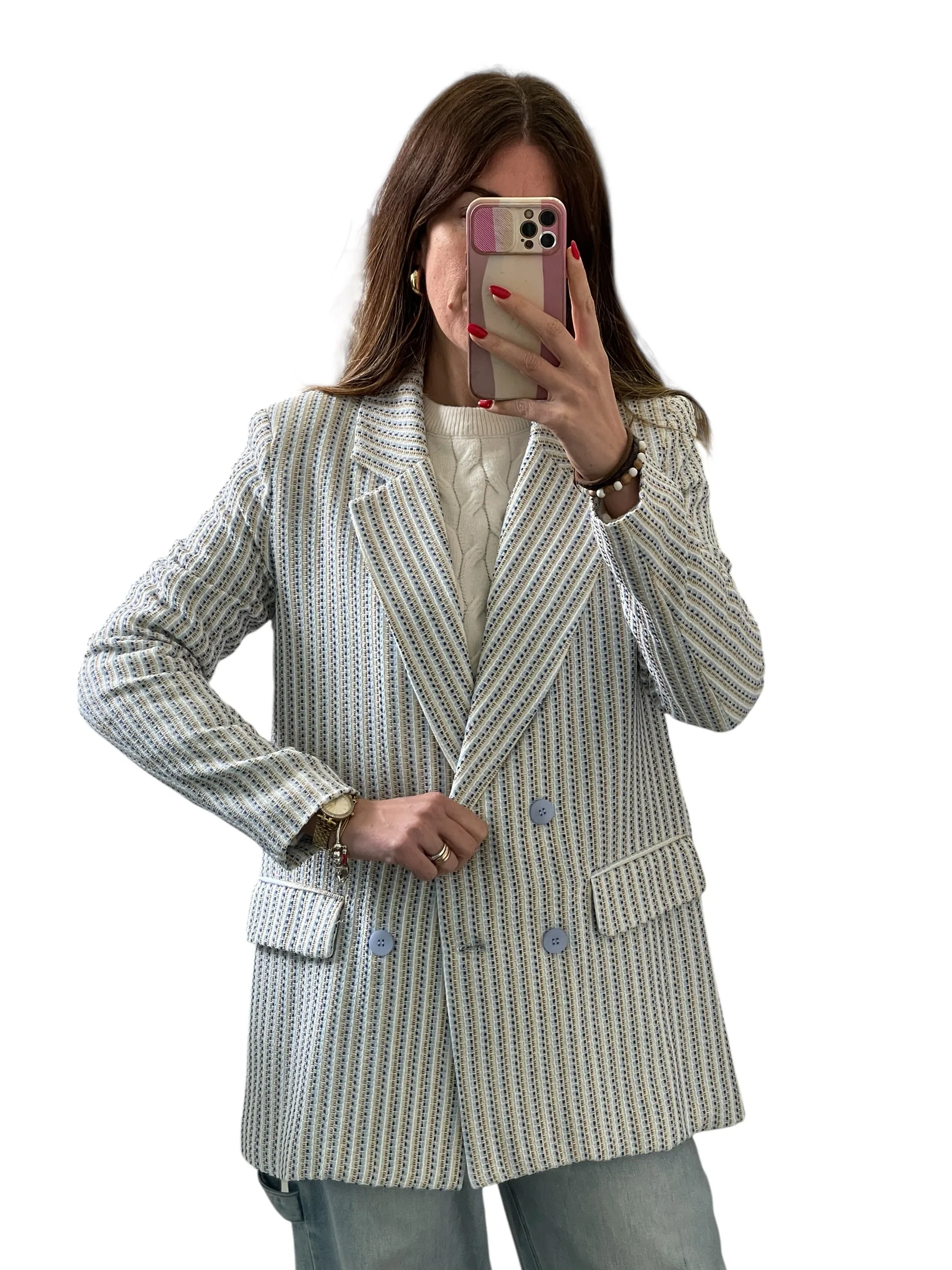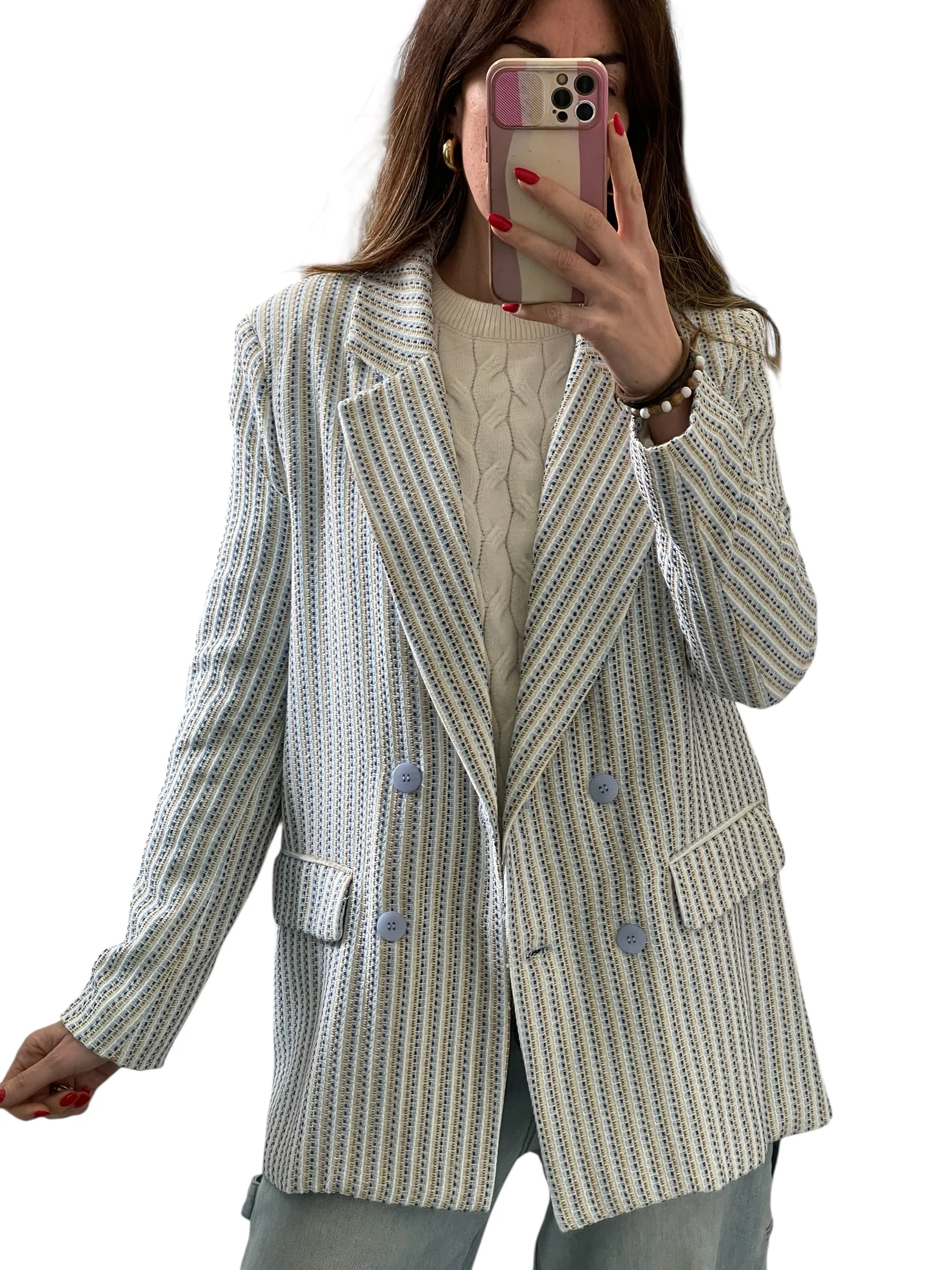 Giacca strutturata con spalline, doppio petto foderata, tessuto chanel con filamenti in lurex.