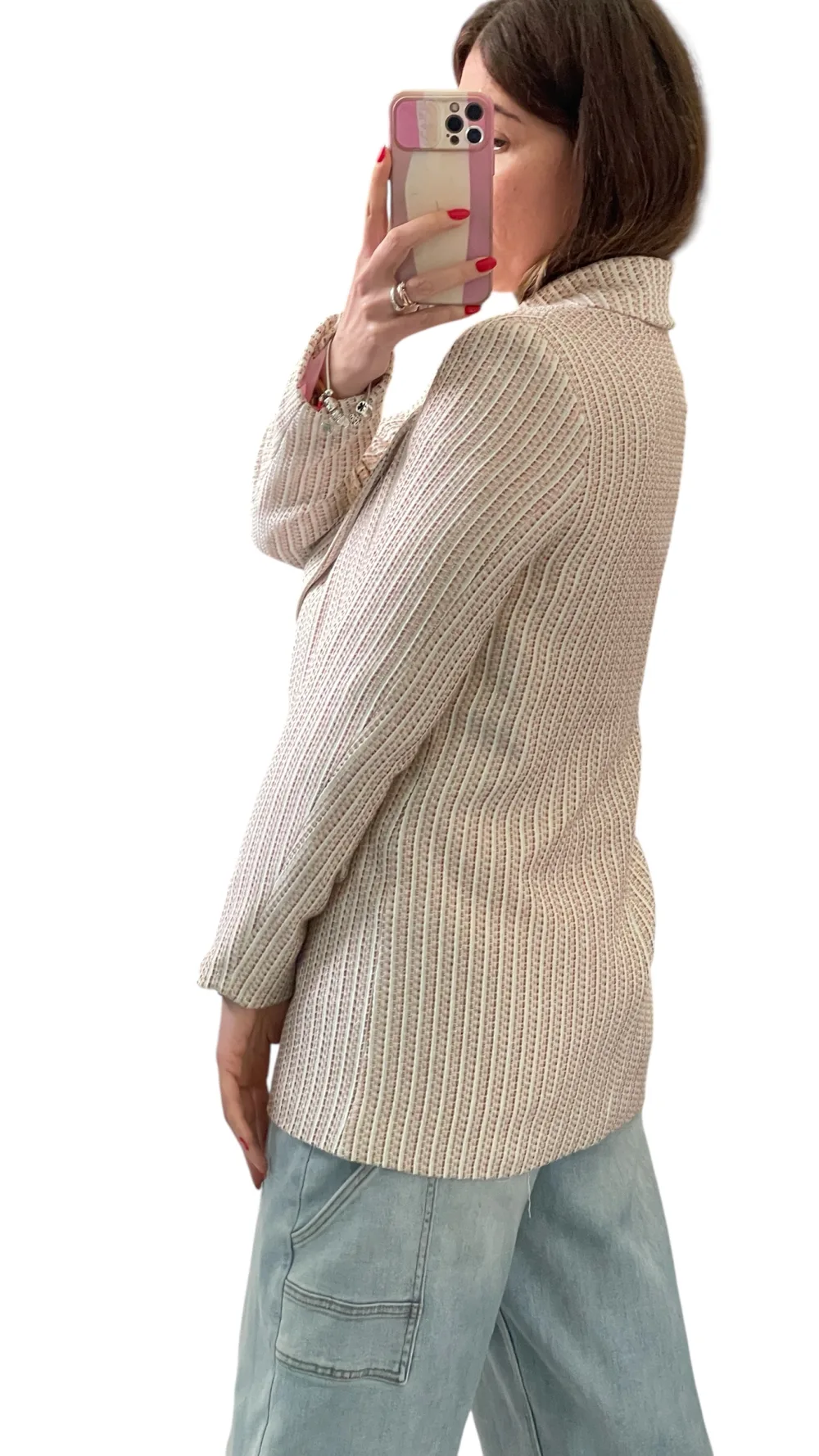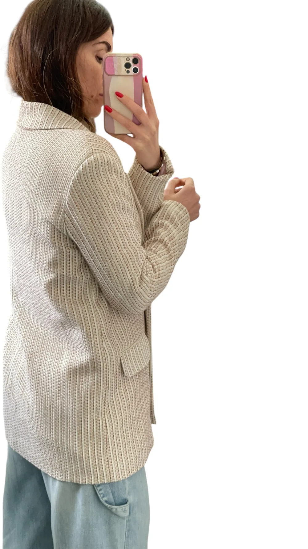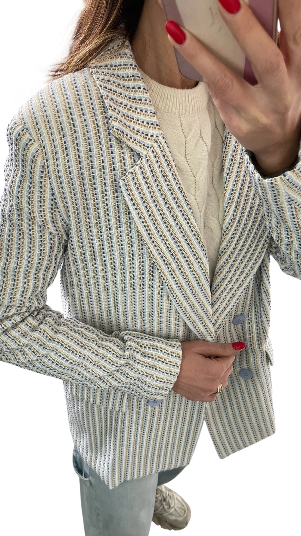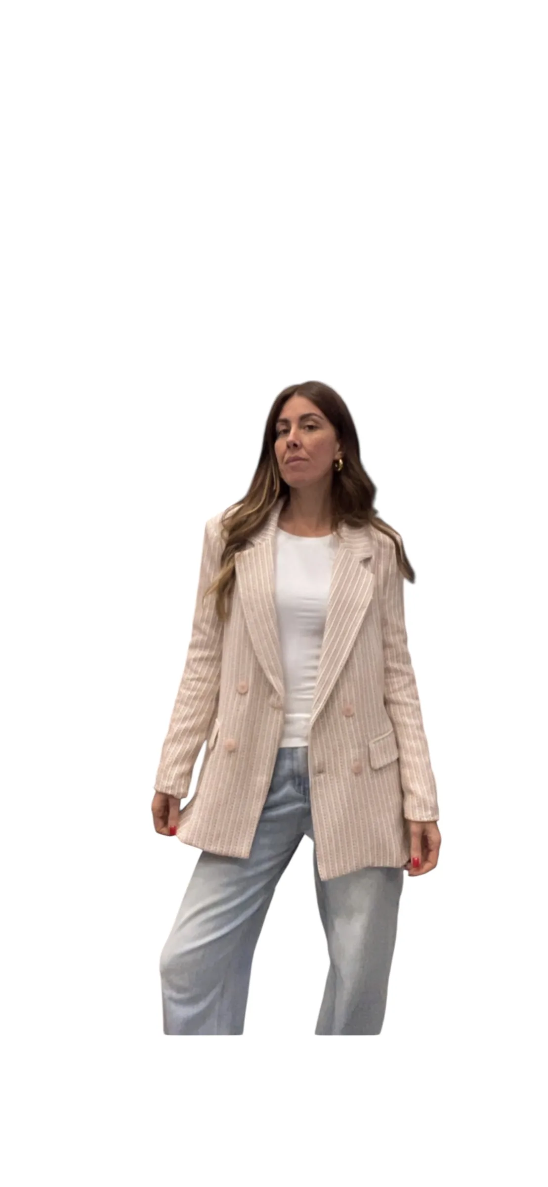 Giacca strutturata con spalline, doppio petto foderata, tessuto chanel con filamenti in lurex.