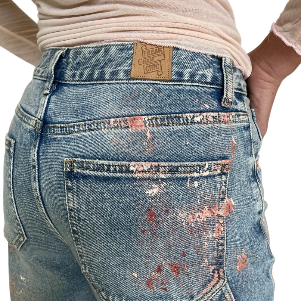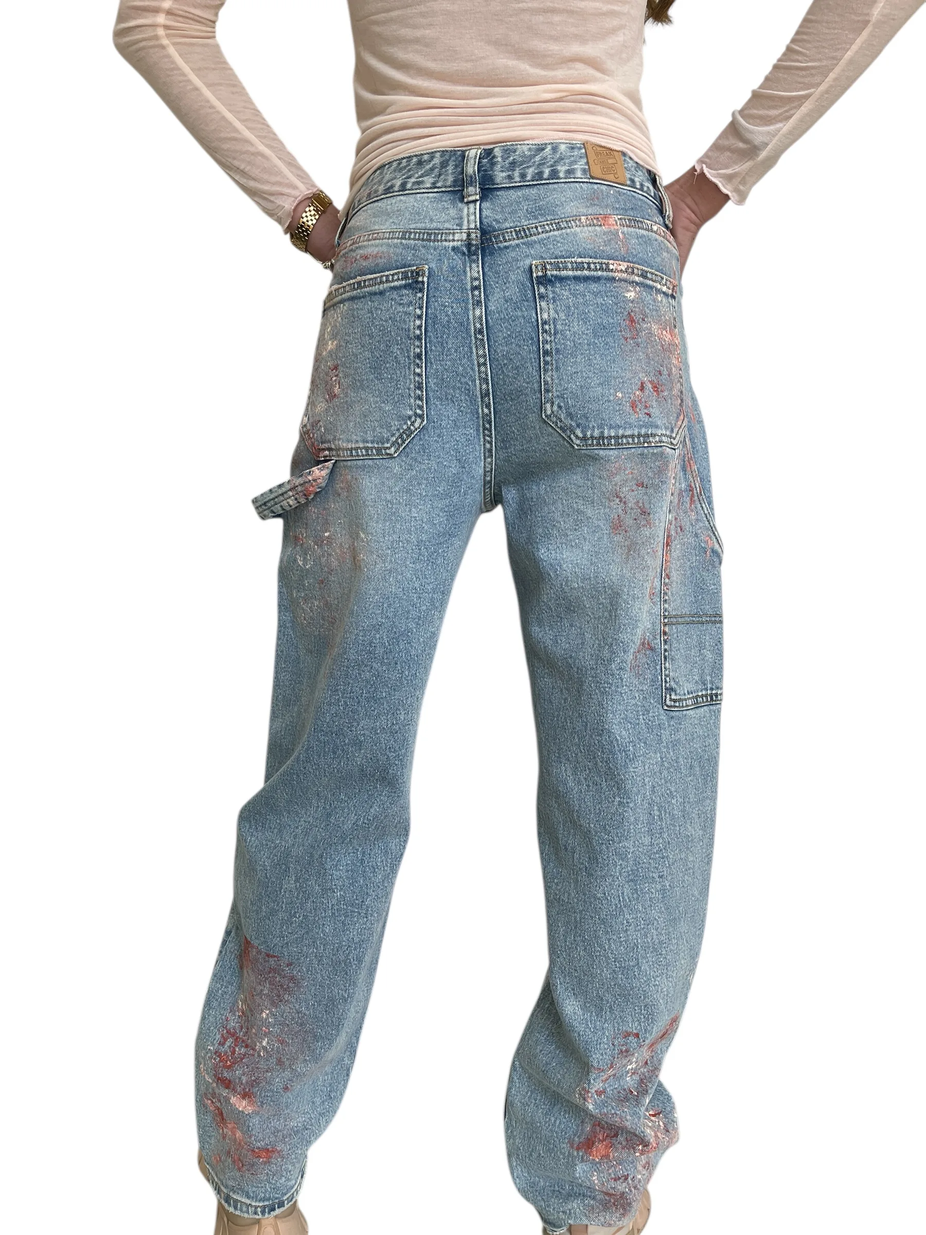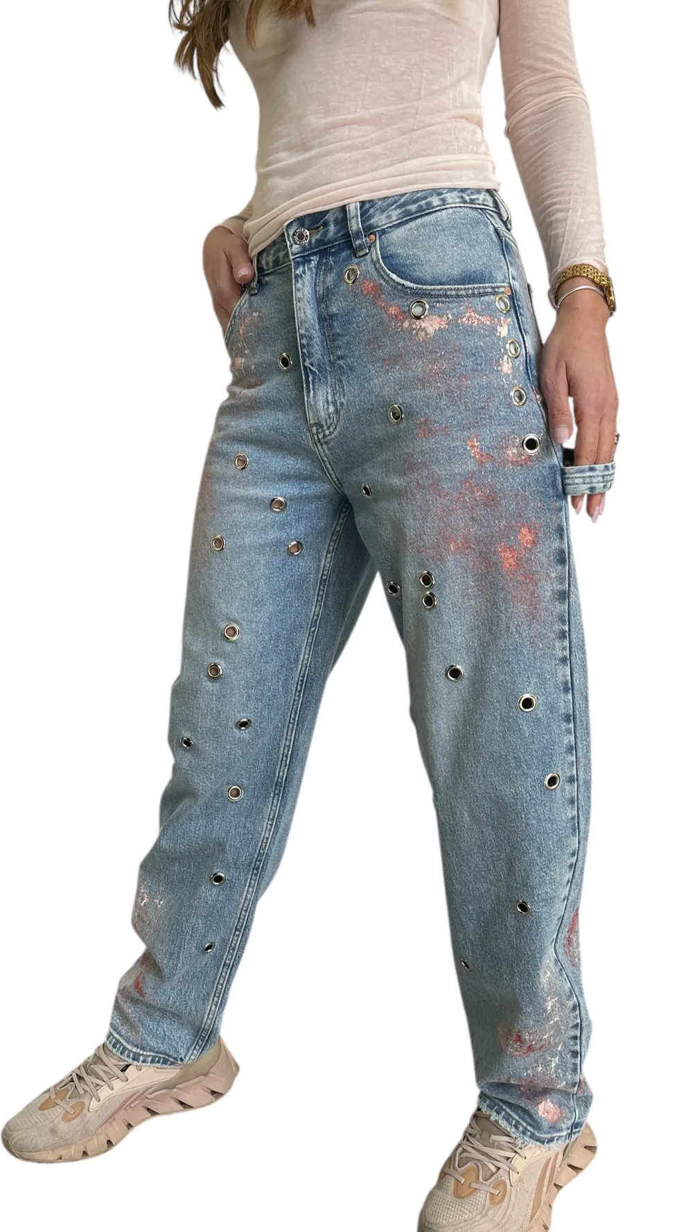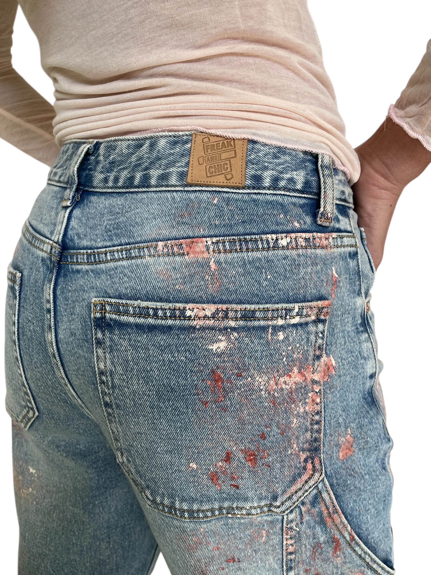 Jeans modello carpenter, dipinto a mano con pigmenti rosa e bianchi, arricchito con occhielli silver in acciaio vestibilita’ comoda