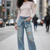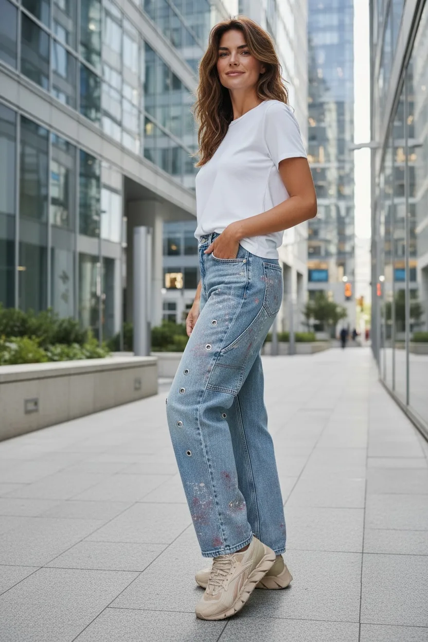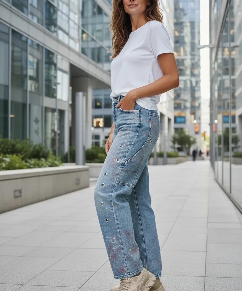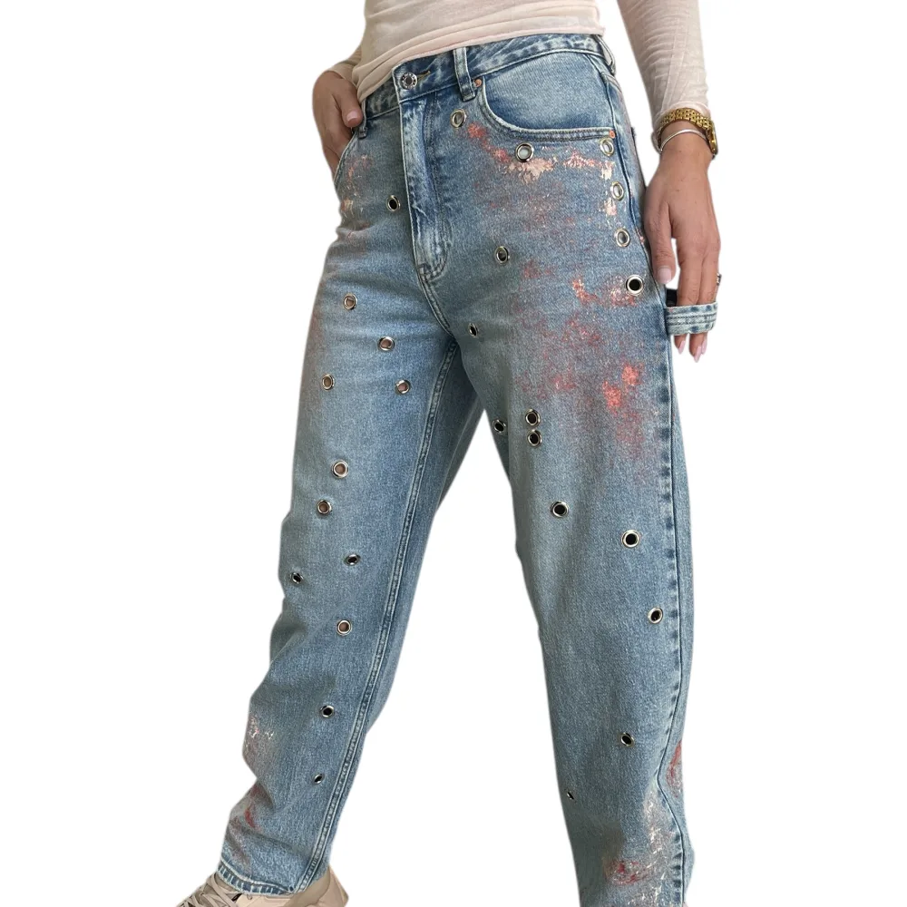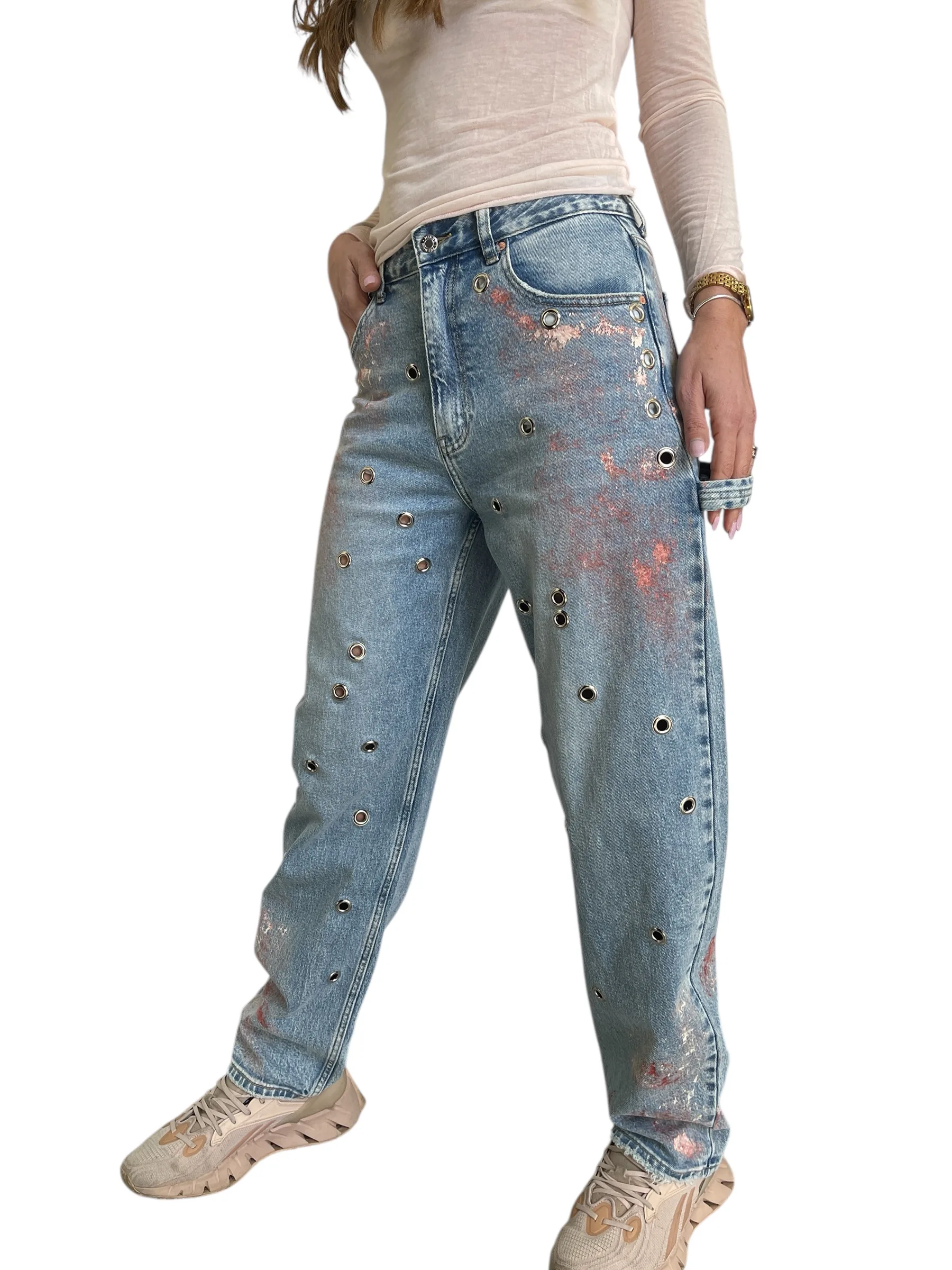 Jeans modello carpenter, dipinto a mano con pigmenti rosa e bianchi, arricchito con occhielli silver in acciaio vestibilita’ comoda