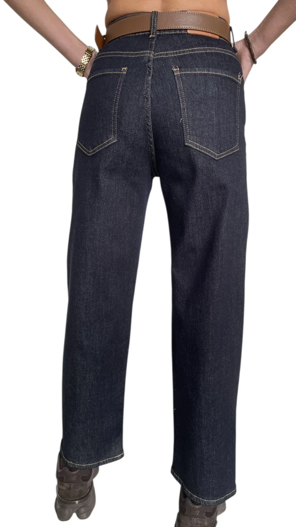 Jeans carrot scuro, lavaggio integrale, vestibilita’ comoda leggermente elastico, con cintura integrata