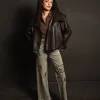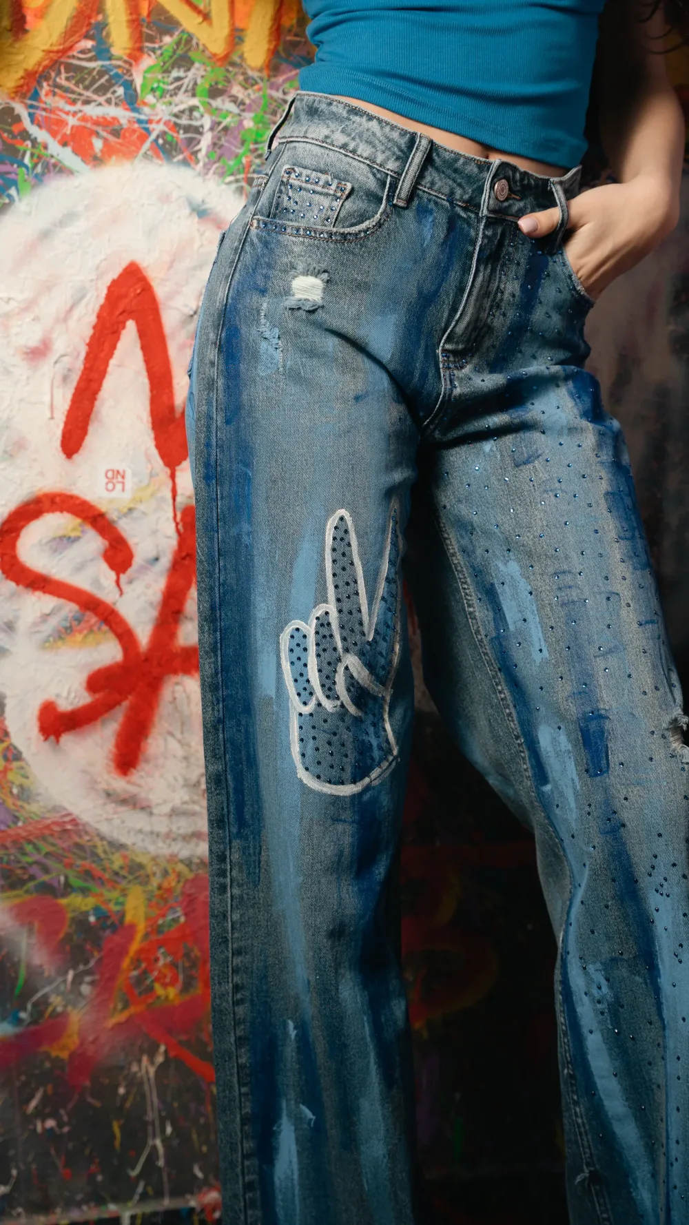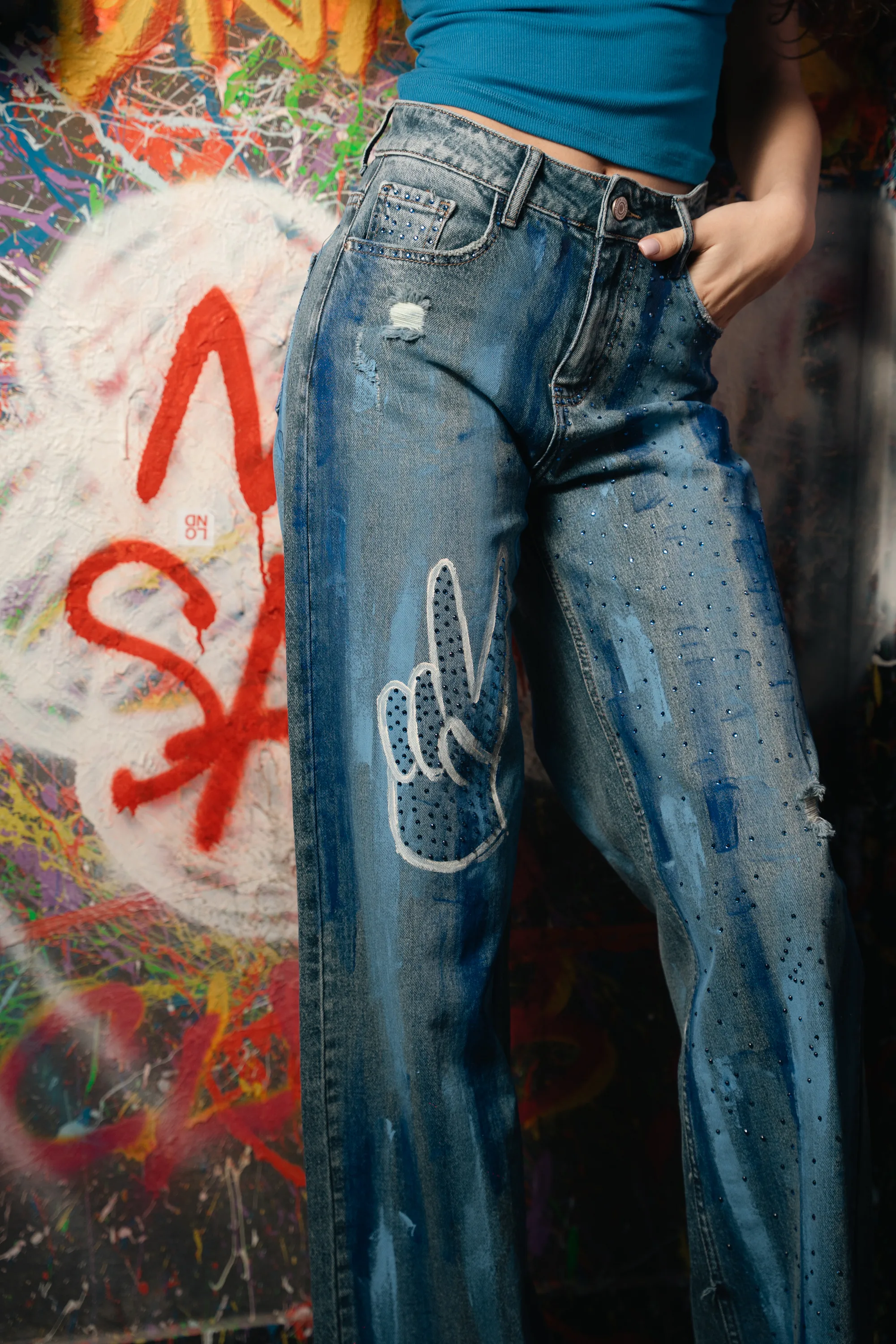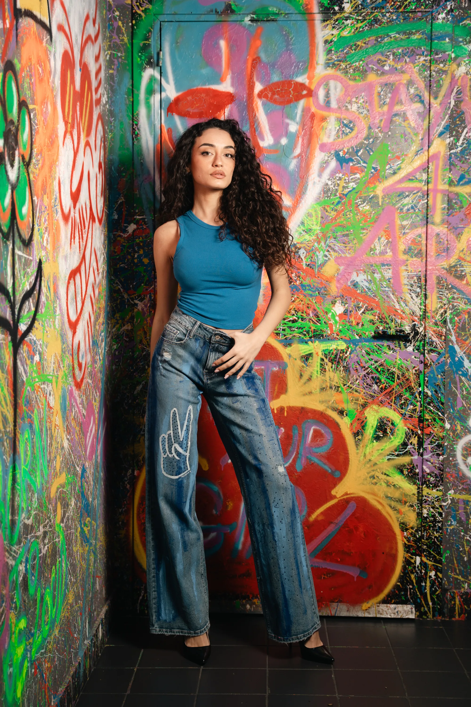 Jeans modello palazzo lavaggio medio scuro con pennellate azzurro e blu royal e disegnato a mano, cascata di strass blu