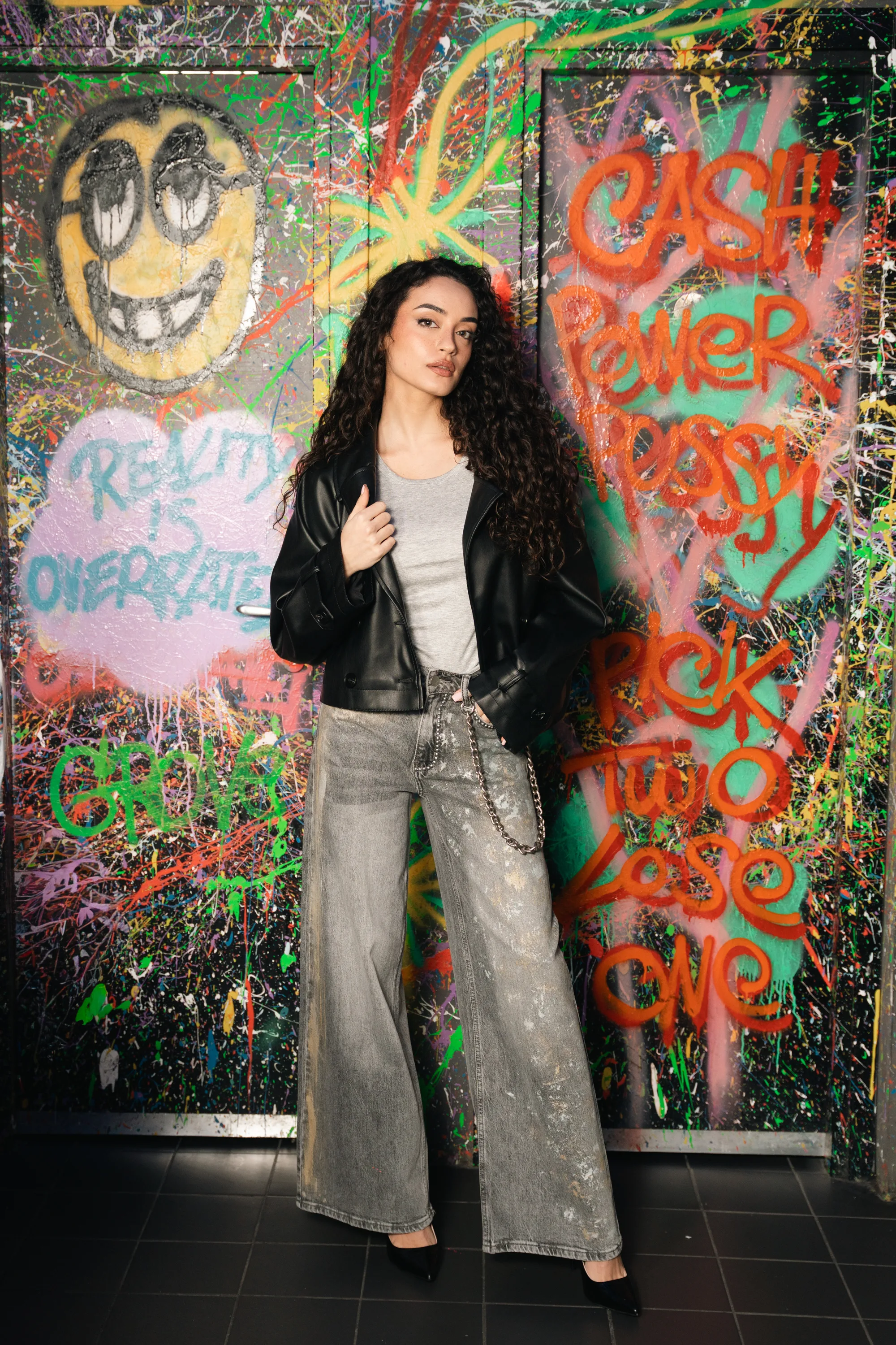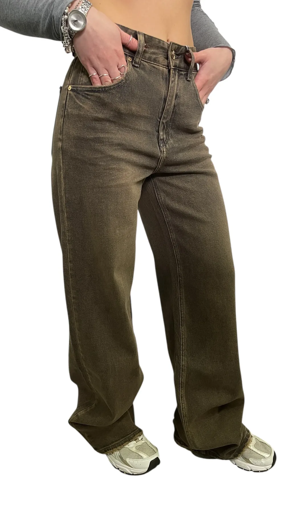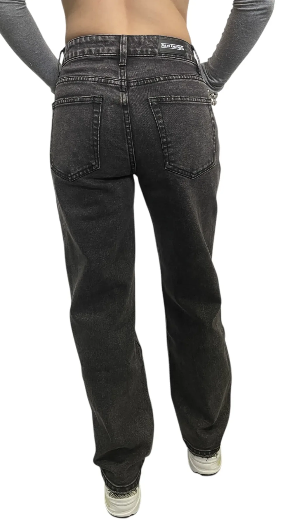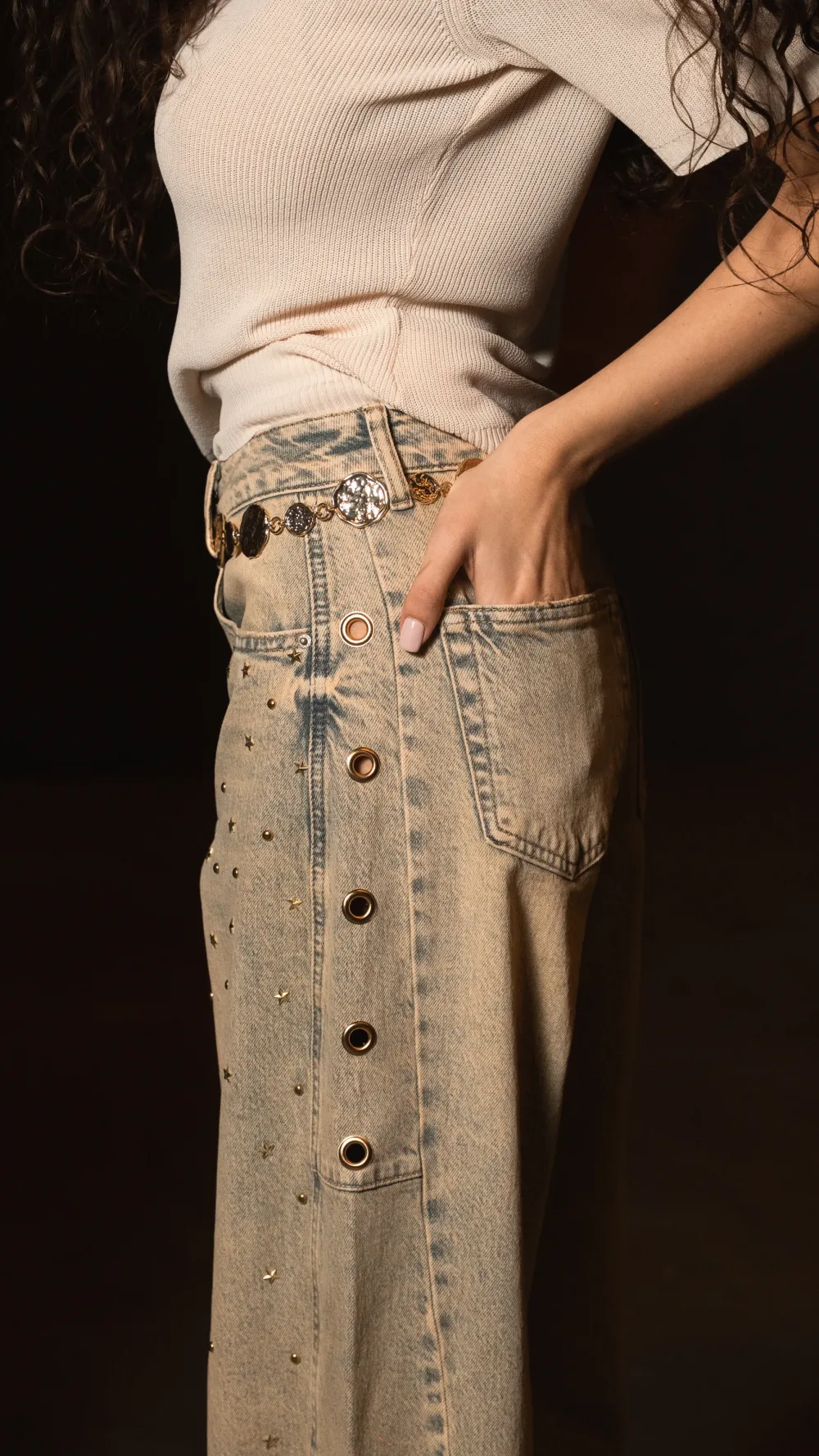 Jeans modello palazzo lavaggio grigio non elastico dipinto a mano con applicazioni di borchie argento e catena laterale