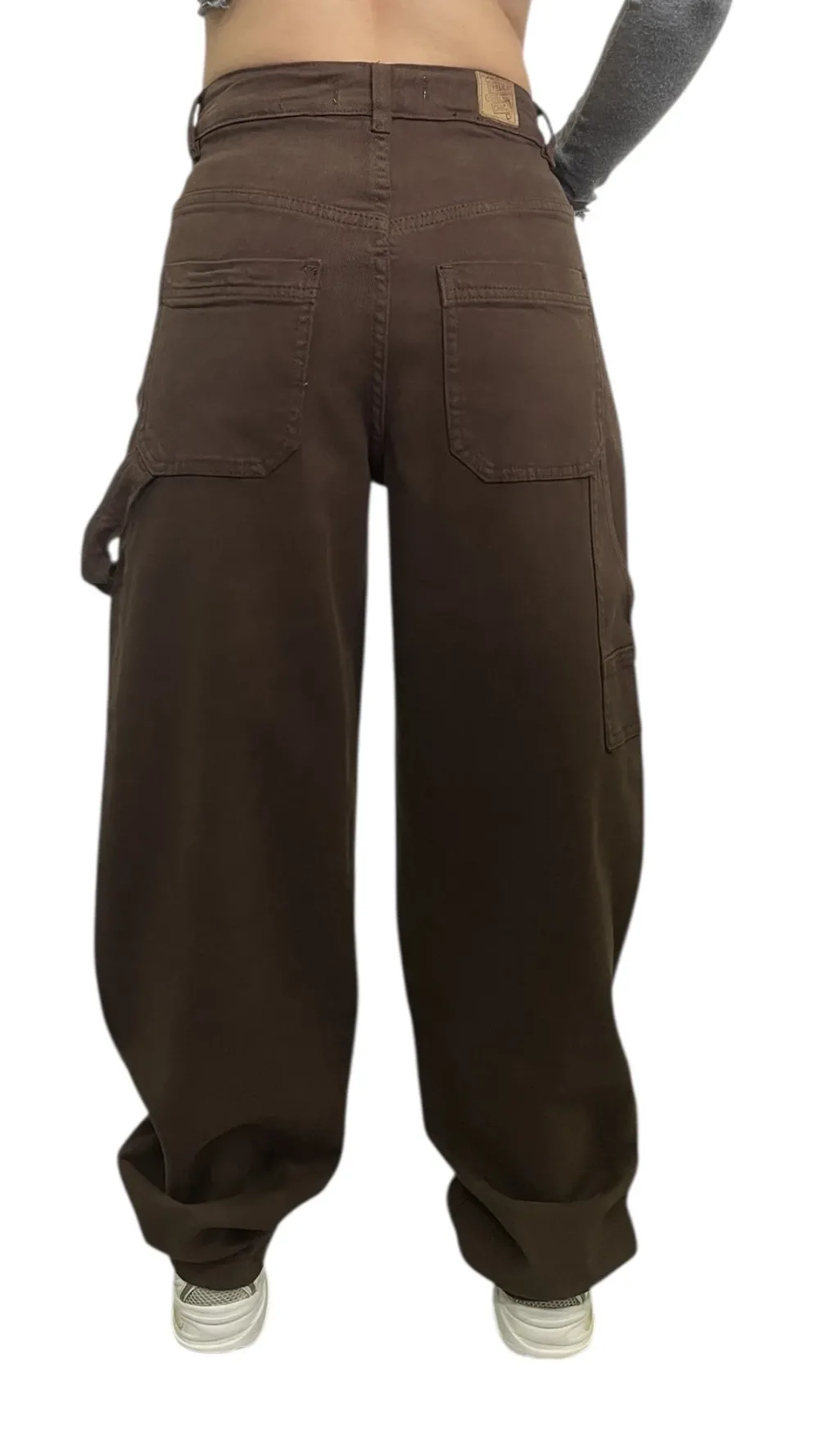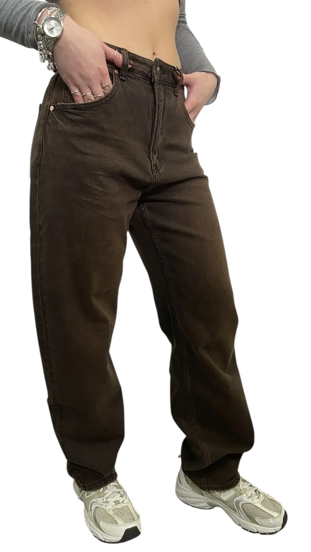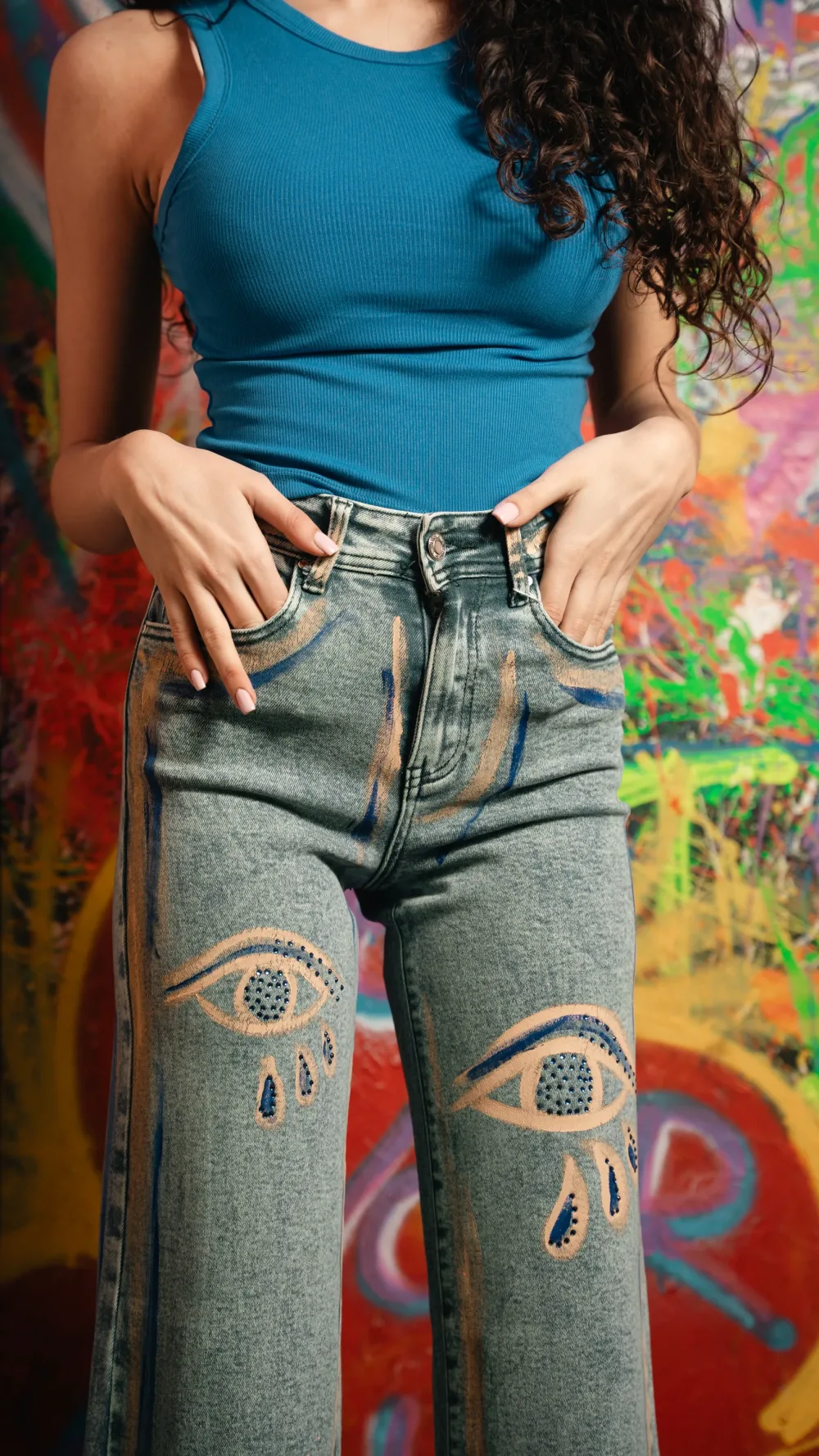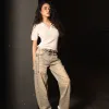 Jeans modello palazzo lavaggio grigio non elastico dipinto a mano con applicazioni di borchie argento e catena laterale