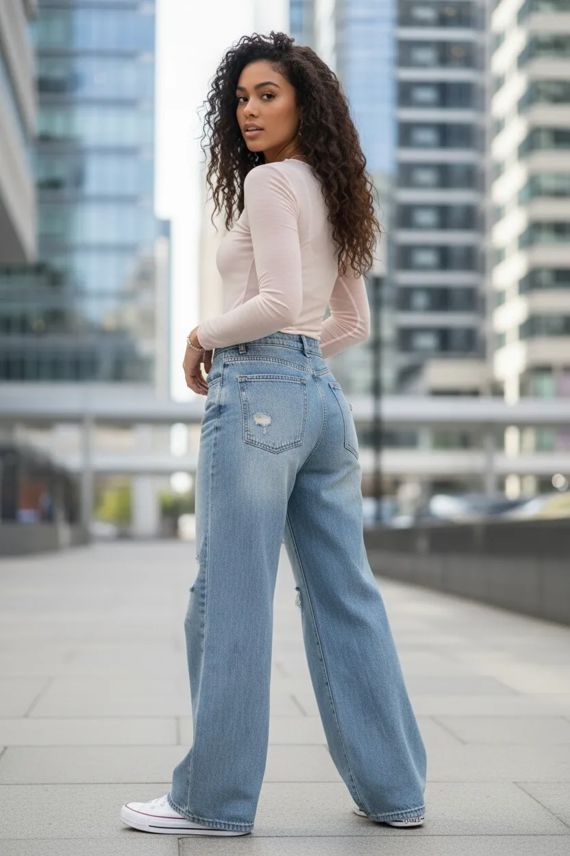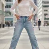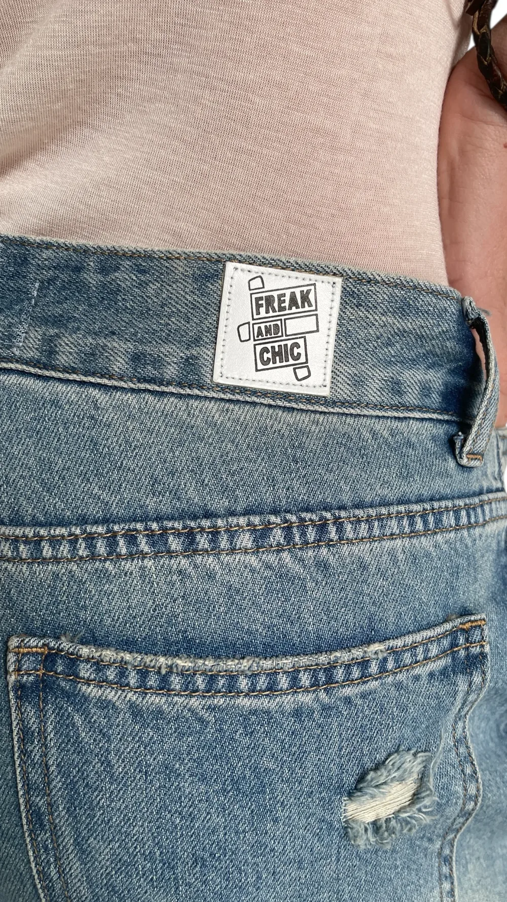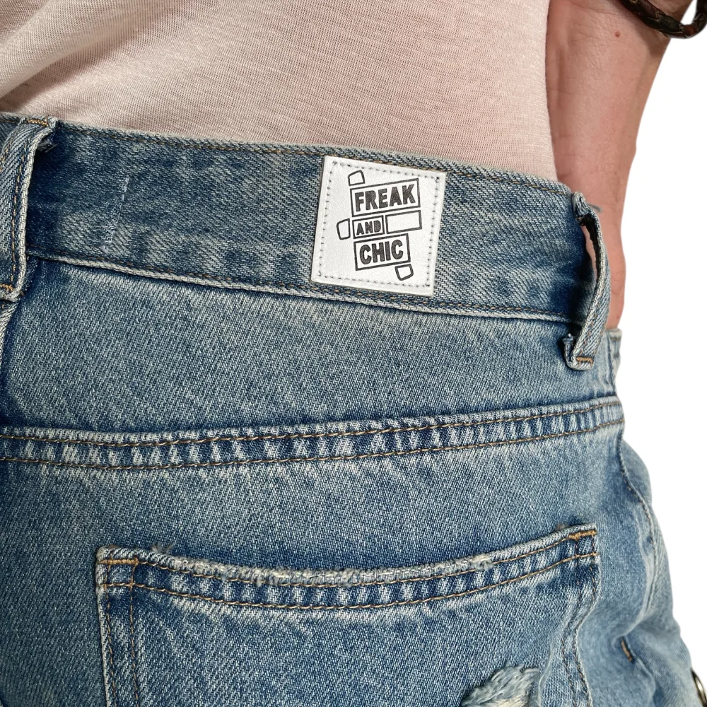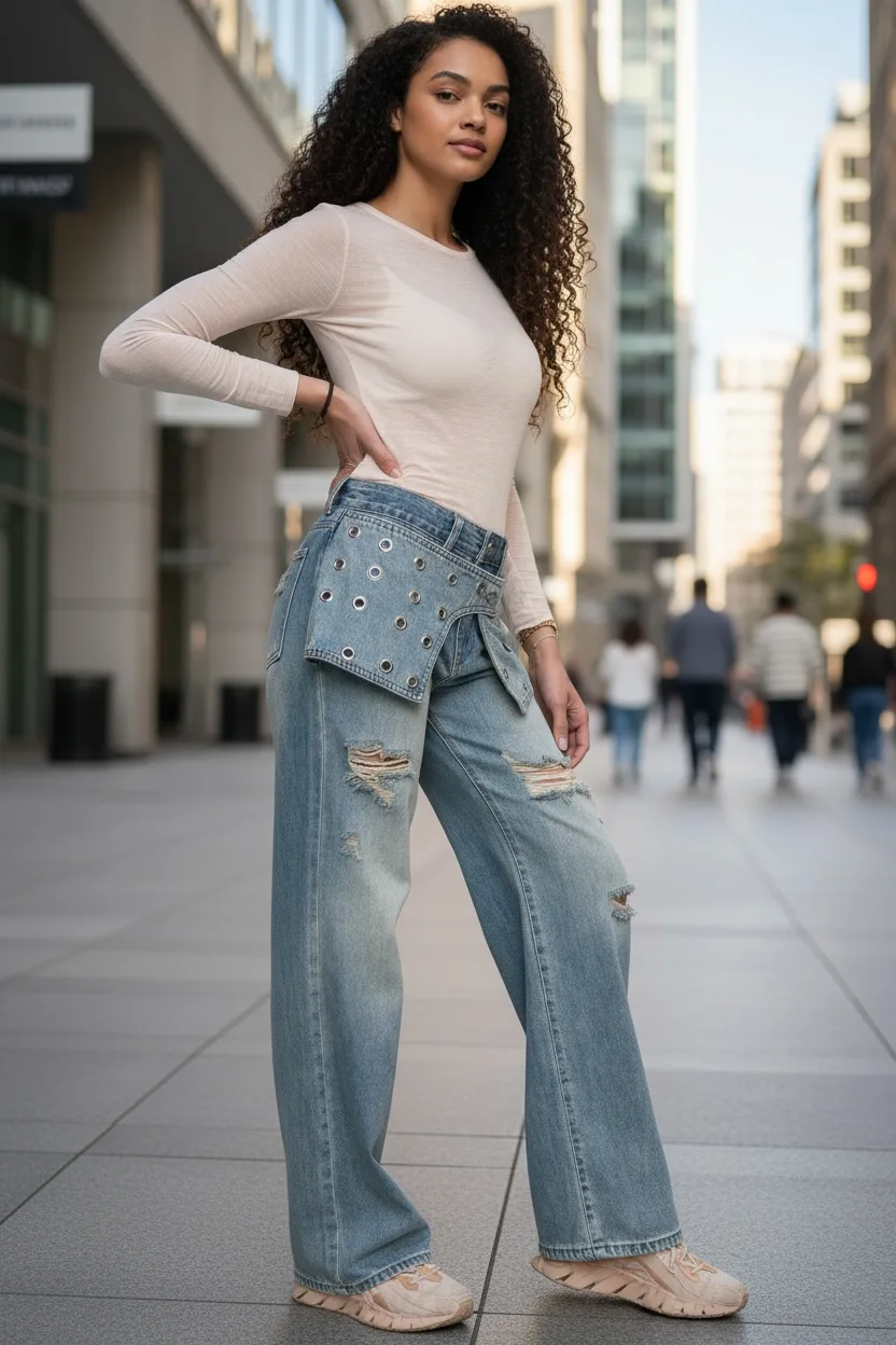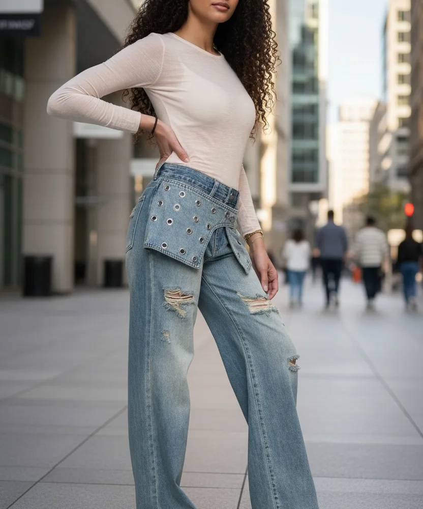 Jeans palazzo con patta sul davanti con occhielli in acciaio messi uno per uno a mano, piccoli strappi sul davanti.