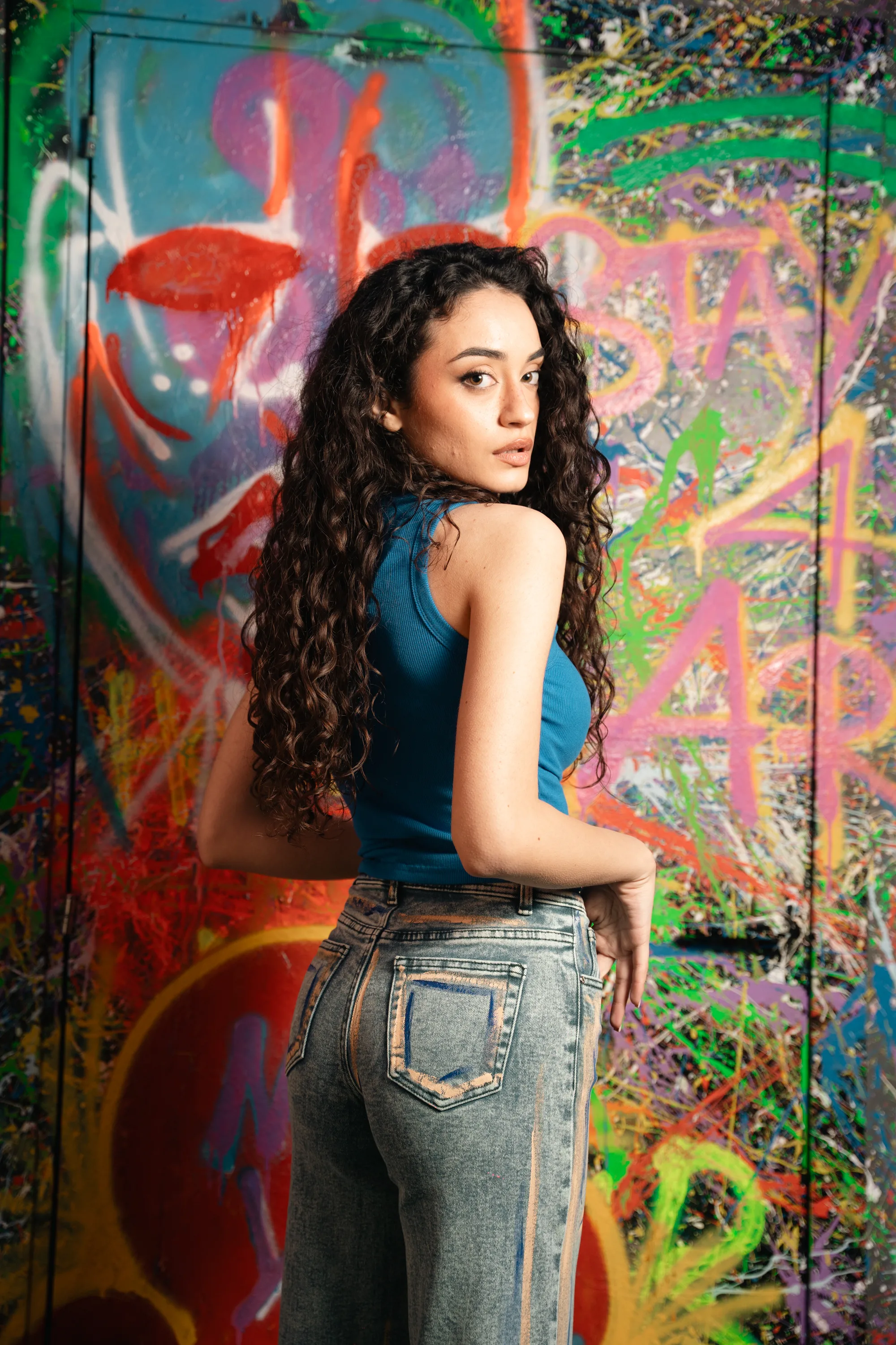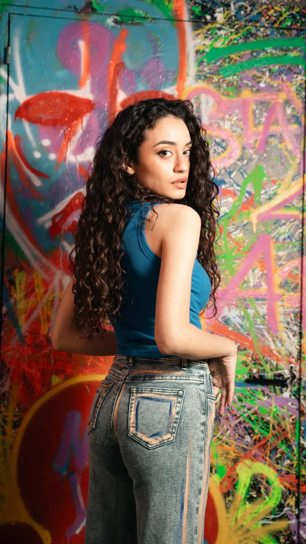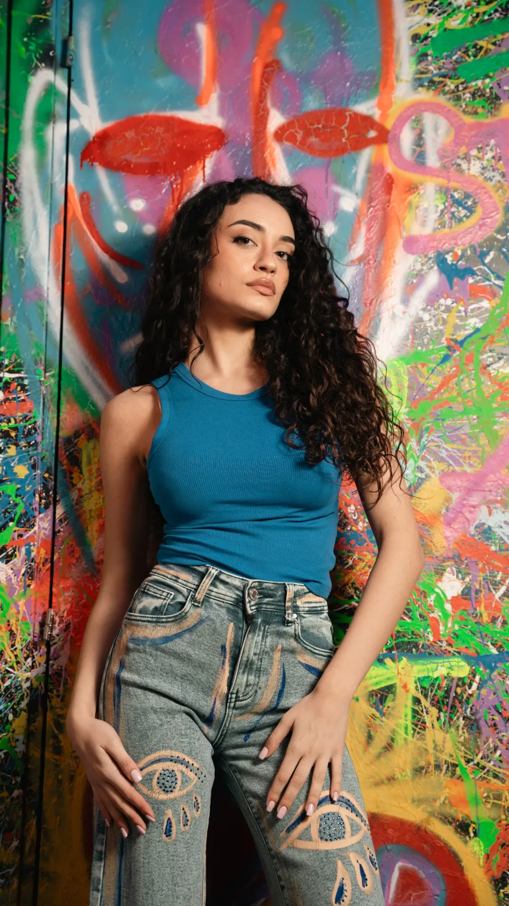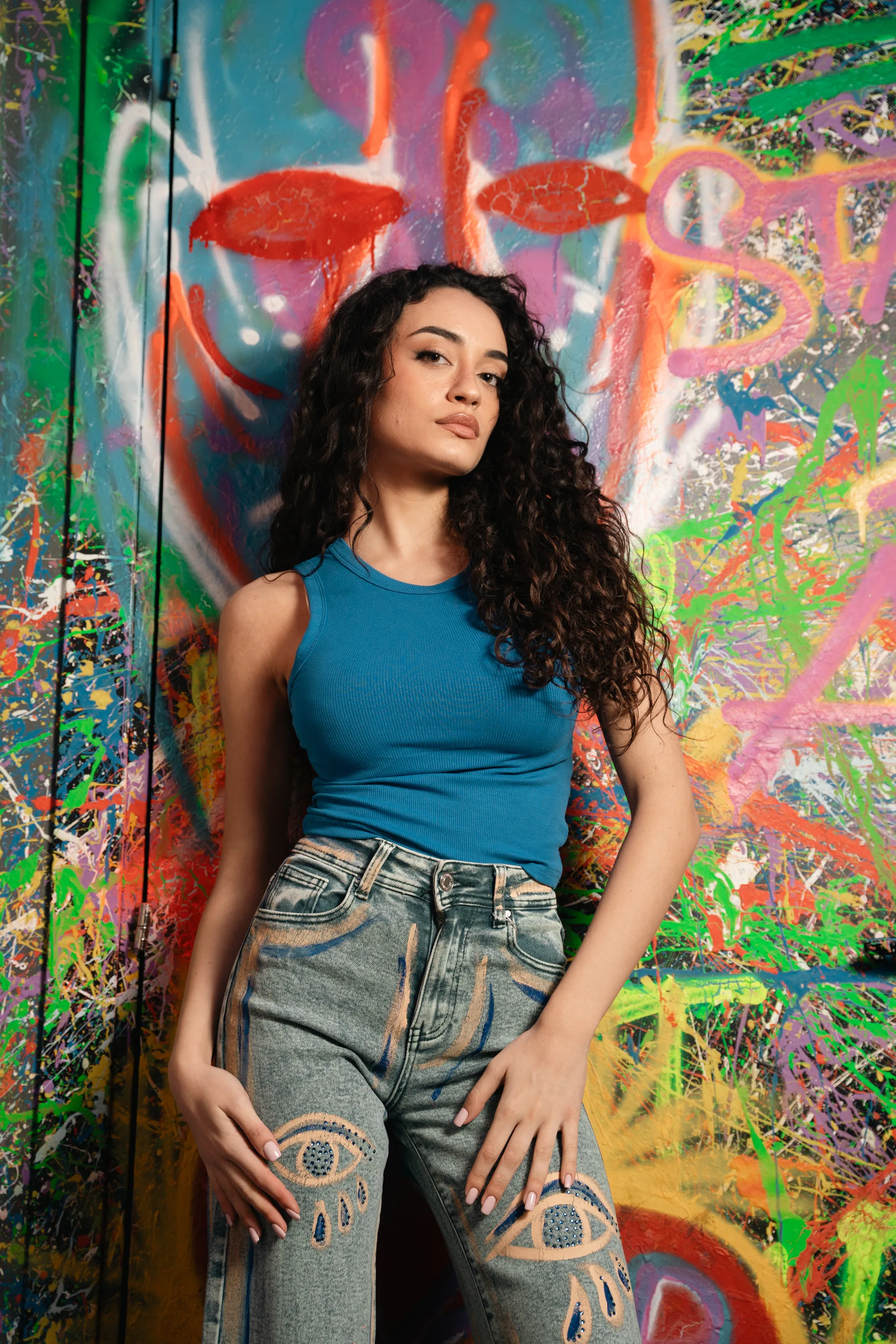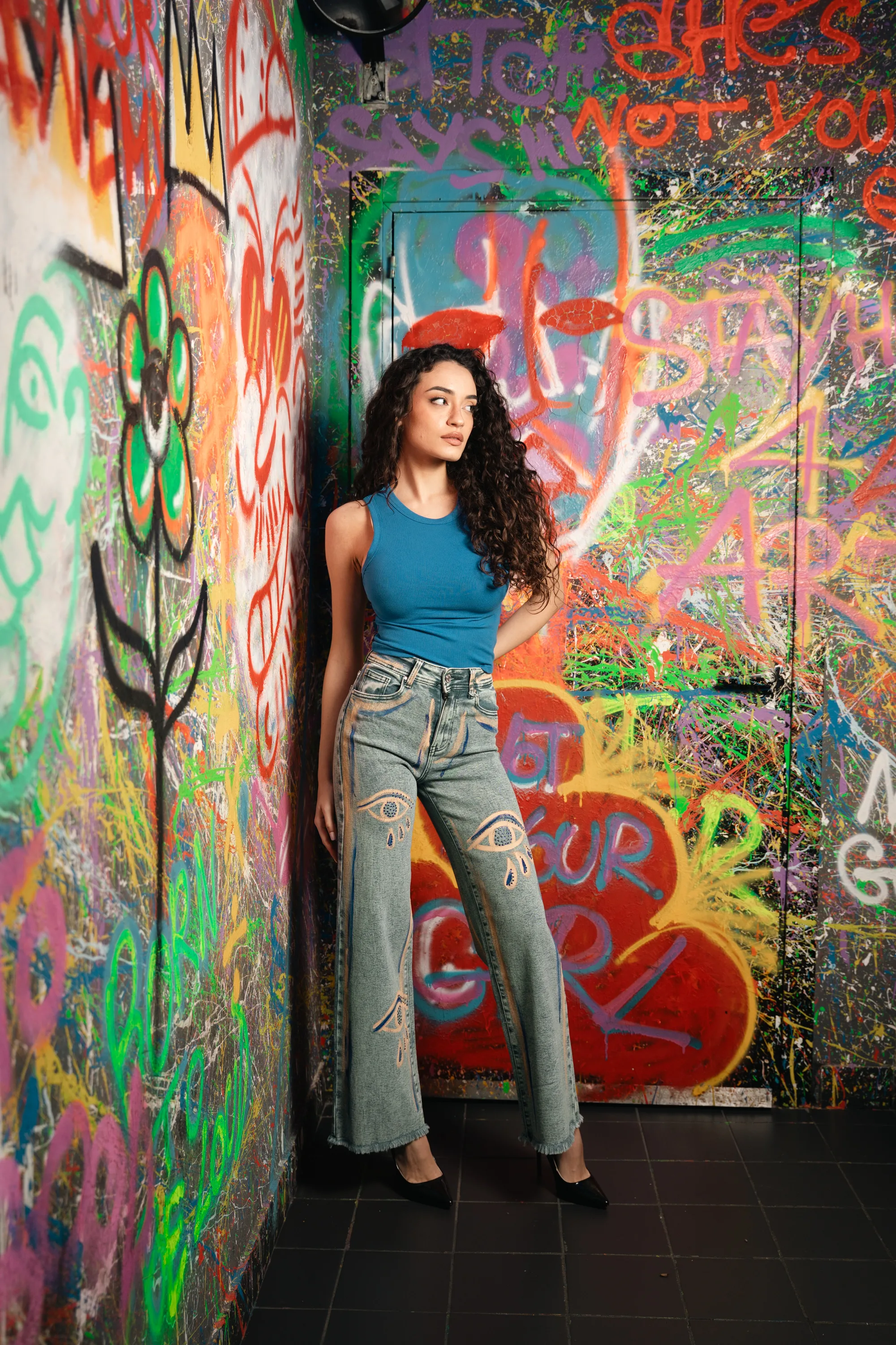 Jeans modello cropped semi elastici sfrangiato giù dipinto a mano e con micro strass blu