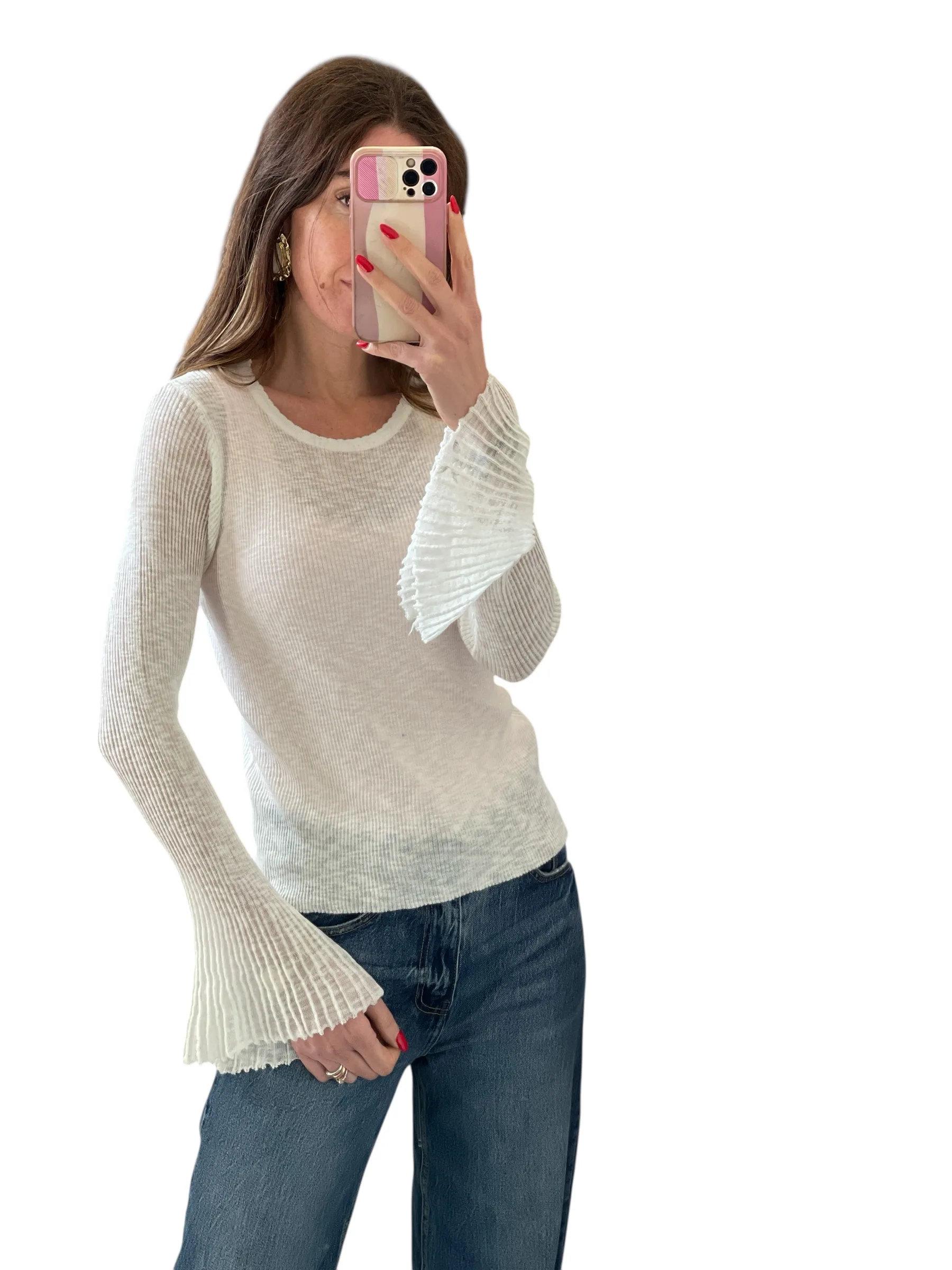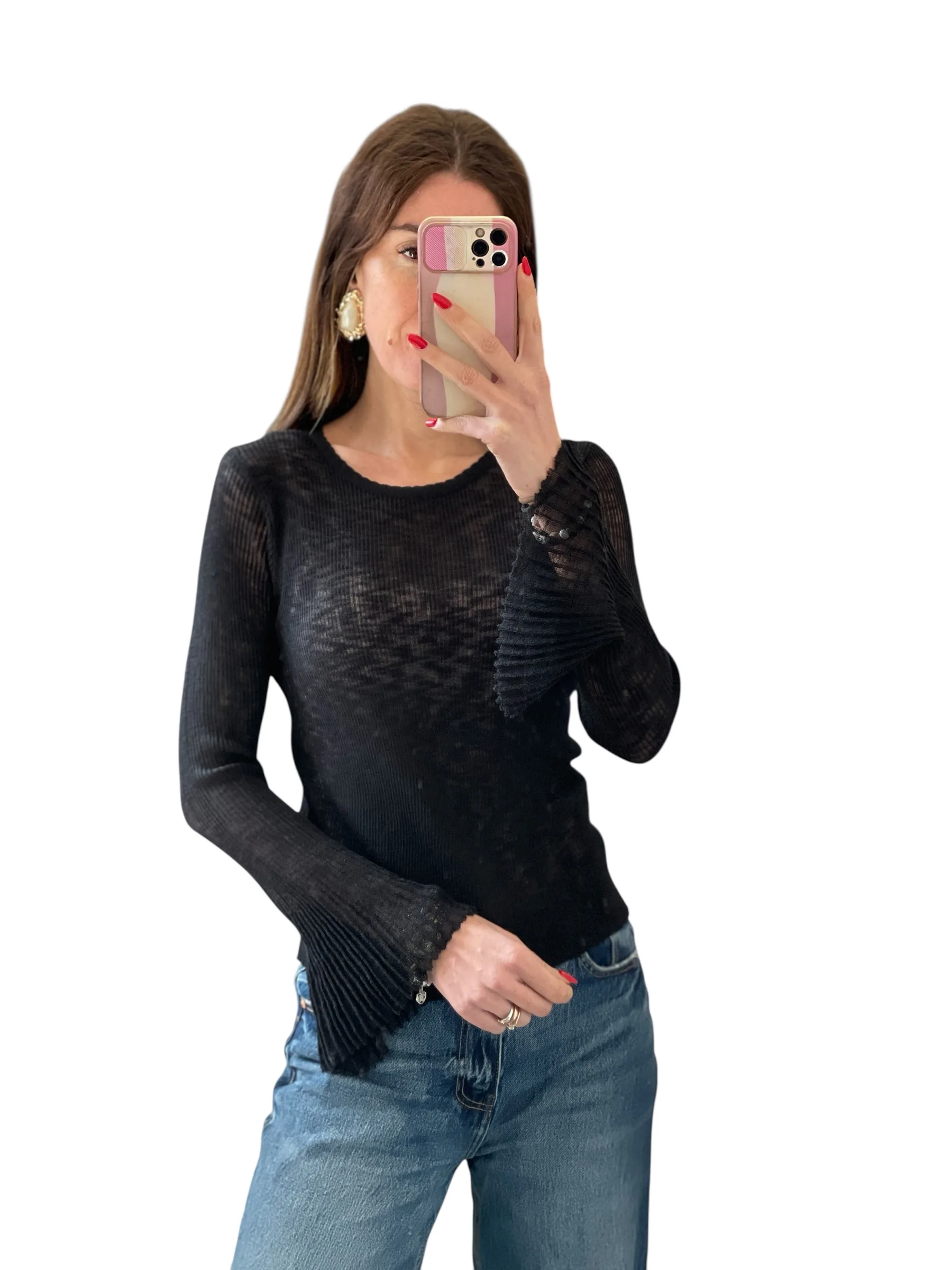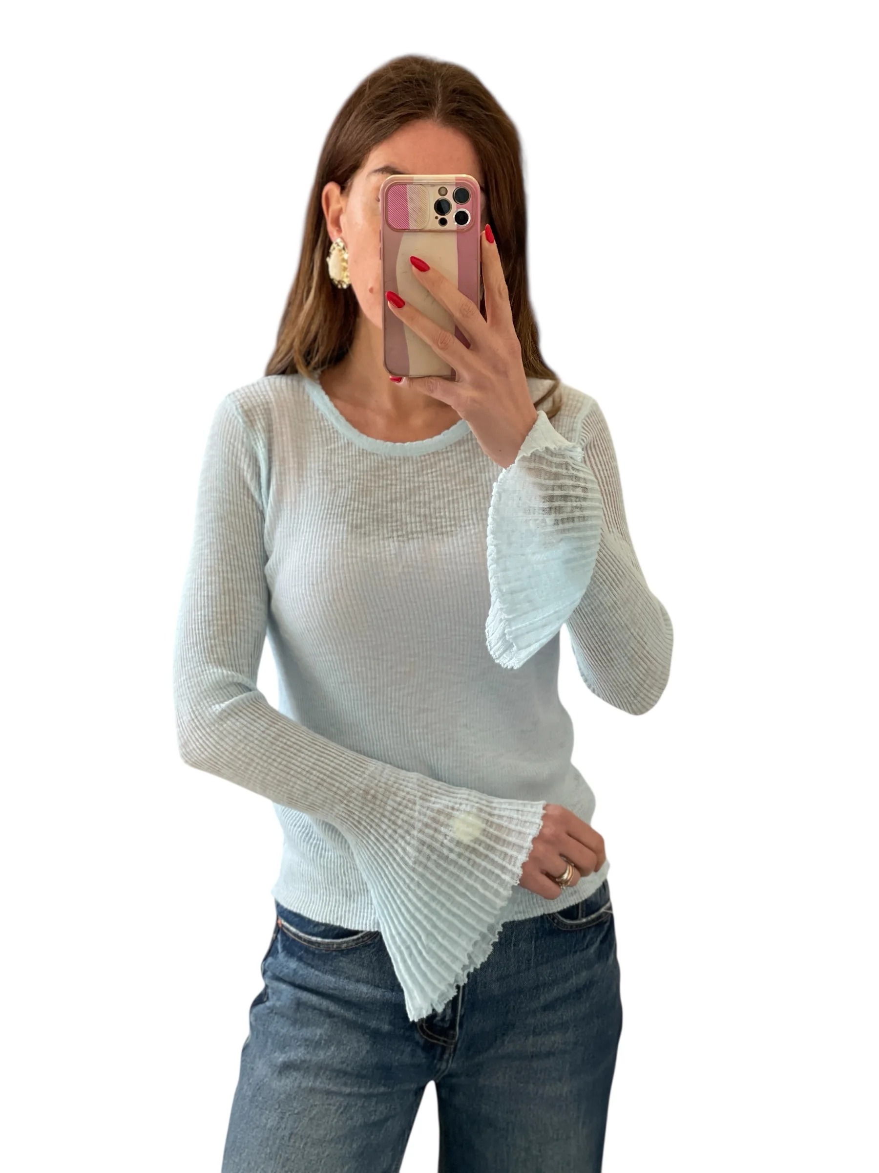 Maglia in filato trasparente giro collo con manica svasata plissettata