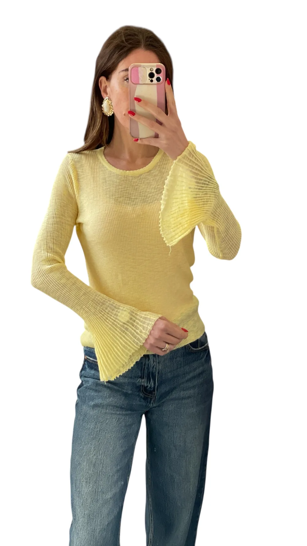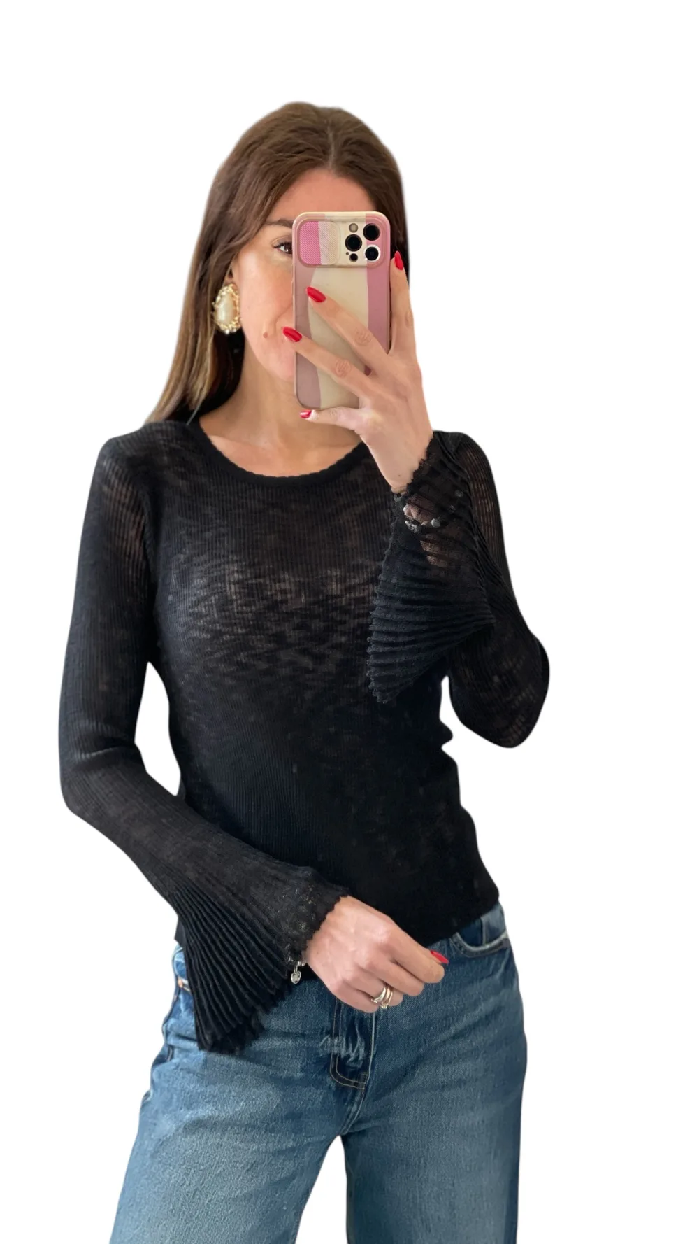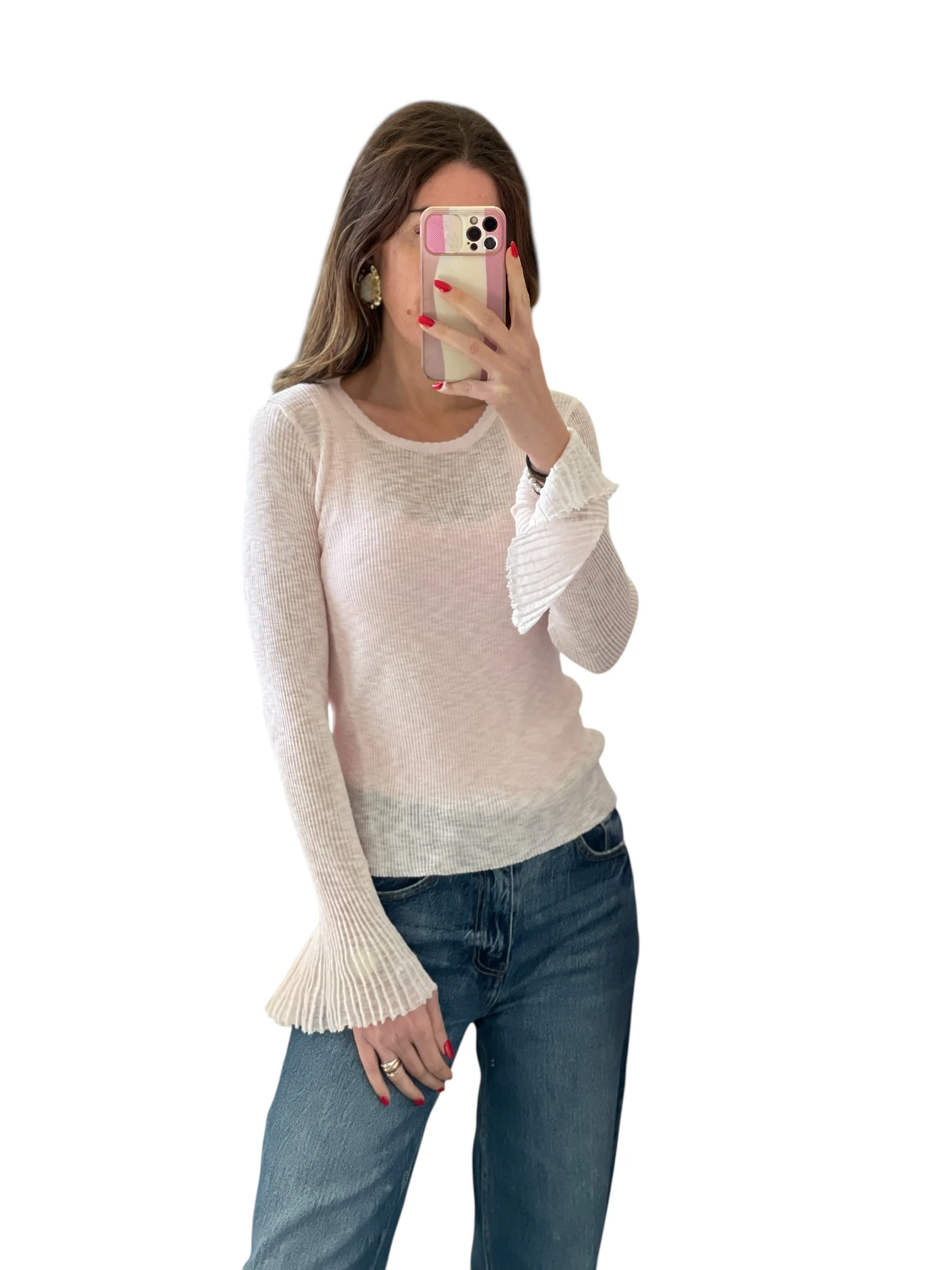 Maglia in filato trasparente giro collo con manica svasata plissettata